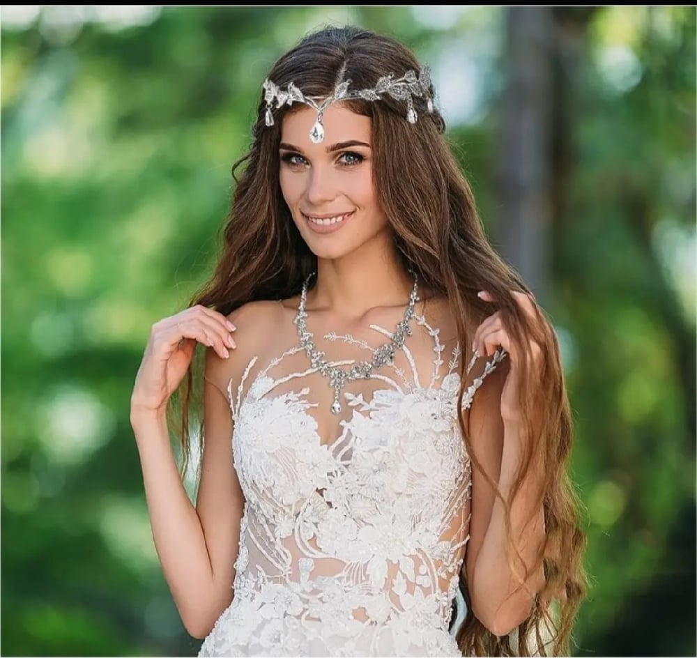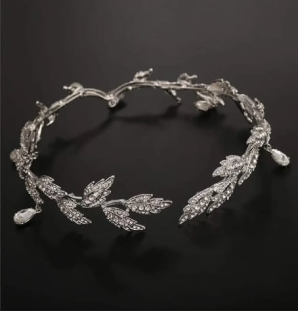 Designed for the bride who walks in her own light, the Celestial Vine Headpiece captures the quiet magic of the stars. Handcrafted with crystal-dusted leaves and delicate teardrop gems, it shimmers like moonlight woven through silver vines — an ode to celestial romance and modern grace.